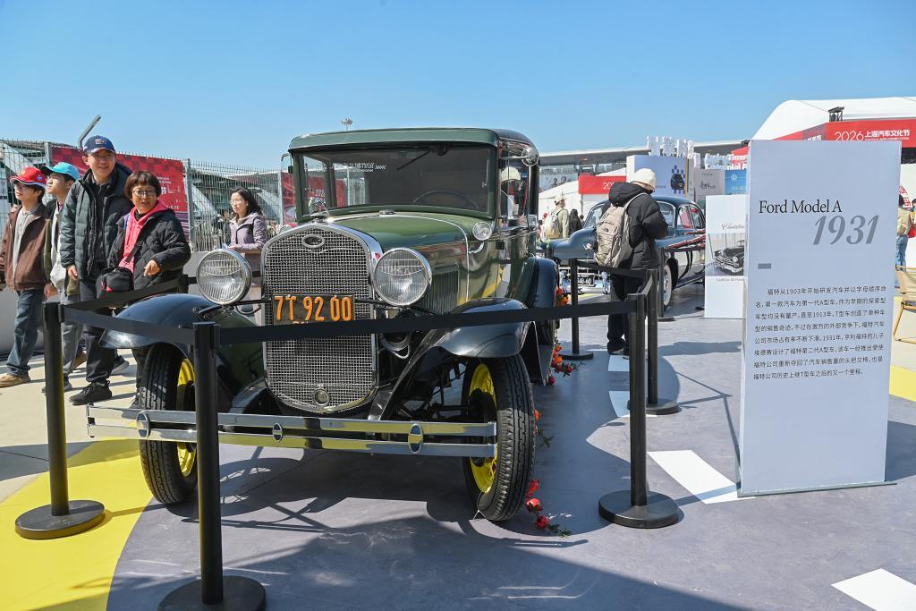 2026年3月13日,人们在上海汽车文化节上了解“古董车”。